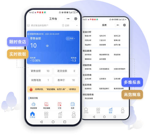 手机随时查营业分析、商品查询、收银查询、会员查询、批发查询、供应商查询等多维度报表,数据实时掌握,决策更精准高效。